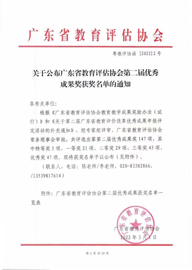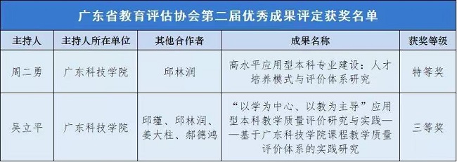 The Guangdong Education Evaluation Association released the list of winners of the Outstanding Achievement Award recently. The "High-level Application-oriented Undergraduate Program Construction: Research on Talent Training Model & Evaluation System" led by GUST’s Executive Vice President Zhou Er’yong won the Grand Award, and the " ‘Study-centered, teaching-led’ Application-oriented Undergraduate Teaching Quality Evaluation Research & Practice—A Practical Research Based on the Curriculum Teaching Quality Evaluation System of Guangdong University of Science & Technology" led by GUST’s Vice President Wu Liping won the Third Award.