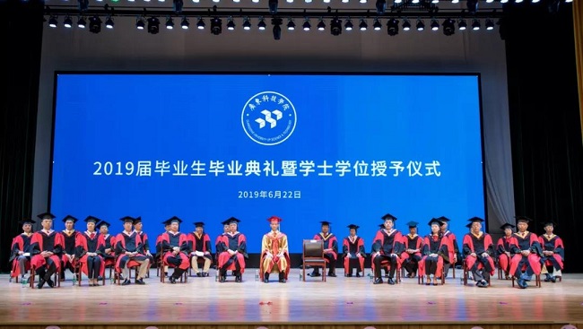 (Party Work Department) Guangdong University of Science and Technology (GUST) held her Commencement Graduation Ceremony in the gymnasium on June 24th. Liang Ruixiong, President of GUST, Secretary of the party and Chairman of Academic Degree Evaluation Committee; Zhou Er'yong, Executive Vice President of GUST and Vice Chairman of Academic Degree Evaluation Committee; Li Cai, Vice President of GUST and Vice Chairman of Academic Degree Evaluation Committee; Sun Jian, Vice President of GUST; Wang Yanbin, Vice President of GUST; Zhao Huihua, Vice President of GUST; Deng Zhixiong, Assistant to President of GUST; Deans of Secondary Colleges; heads of departments; and committee members of Academic Degree Evaluation Committee, namely Prof. Yu Dongmei, Prof. Liu Chao, Prof. Xiao Shicong, Prof. Chen Guangyuan, Prof. Shen Panyang, Prof. Luo Ming, Prof. Yu Yuhuan, Prof. Gao Yinqiao, Prof. Gai Xiaolan, Prof. Tan Liping and Prof. Dai Yong attended the ceremony. The ceremony was presided over by Chen Biaoxin, Vice Secretary of the party and Vice President of GUST.